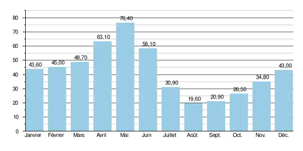 Le débit instantané maximal enregistré a été de 1 650 m3/s le , tandis que la valeur journalière maximale était de 1 080 m3/s le [2]. En comparant la première de ces valeurs avec l'échelle des QIX de la rivière, il apparaît que ces crues étaient bien plus que des crues cinquantennales, peut-être centennales ou plus, et certainement très exceptionnelles.