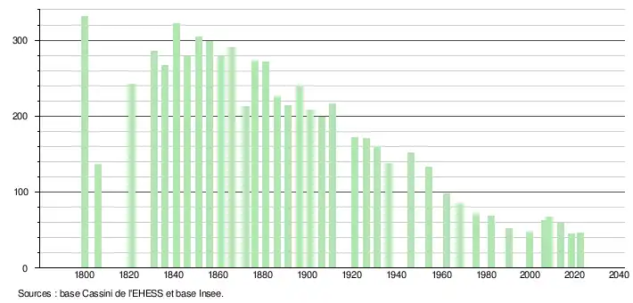L'évolution du nombre d'habitants est connue à travers les recensements de la population effectués dans la commune depuis 1800. Pour les communes de moins de 10000habitants, une enquête de recensement portant sur toute la population est réalisée tous les cinqans, les populations de référence des années intermédiaires étant quant à elles estimées par interpolation ou extrapolation[7]. Pour la commune, le premier recensement exhaustif entrant dans le cadre du nouveau dispositif a été réalisé en 2008[8].