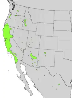 L'espèce est présente dans la majorité de la Californie, y compris la côte, Klamath Mountains, Peninsular Ranges, Sierra Nevada, et Transverse Ranges[12],[11]. Elle s'étend au nord jusqu'à l'état de Washington, au sud vers Baja California, et à l'est, dans l'Idaho, Utah, Texas, et Coahuila (au Mexique)[1],[8].