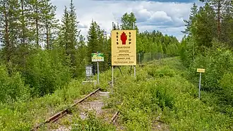 Panneau indiquant la zone frontalière entre la Finlande et la Russie. L'ancienne voie ferrée de Kemijärvi à Kantalahti.