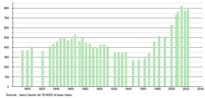 L'évolution du nombre d'habitants est connue à travers les recensements de la population effectués dans la commune depuis 1793. Pour les communes de moins de 10 000 habitants, une enquête de recensement portant sur toute la population est réalisée tous les cinq ans, les populations de référence des années intermédiaires étant quant à elles estimées par interpolation ou extrapolation[16]. Pour la commune, le premier recensement exhaustif entrant dans le cadre du nouveau dispositif a été réalisé en 2008[17].