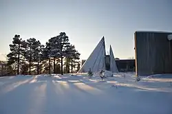 Le parlement sami de Norvège, vue de l'extérieur. L'assemblée est abritée sous un toit évoquant l'habitat traditionnel sami.