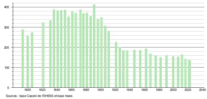 L'évolution du nombre d'habitants est connue à travers les recensements de la population effectués dans la commune depuis 1793. Pour les communes de moins de 10 000 habitants, une enquête de recensement portant sur toute la population est réalisée tous les cinq ans, les populations de référence des années intermédiaires étant quant à elles estimées par interpolation ou extrapolation[13]. Pour la commune, le premier recensement exhaustif entrant dans le cadre du nouveau dispositif a été réalisé en 2006[14].