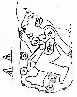 Au nord de la Structure 19 se trouve la Structure 14. Entre ces deux structures, il y avait un couloir, dont la pierre de seuil est célèbre. Il s'agit du Monument 3, qui représente un individu dont la poitrine laisse échapper un flot de sang, symbolisant la victime d'un sacrifice. Entre ses pieds deux glyphes, qui sont la première manifestation de l'écriture zapotèque, qu'on lit généralement «1-mouvement». Les scientifiques pensent que, conformément à l'habitude mésoaméricaine de donner à un individu un nom correspondant à sa date de naissance dans le calendrier rituel de 260 jours, il s'agit du nom de la victime.