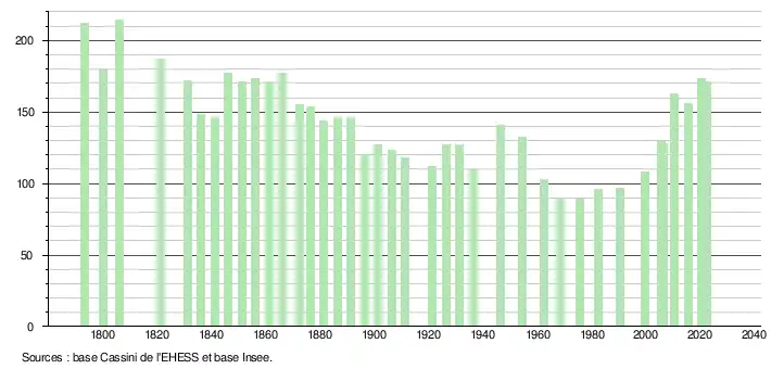 L'évolution du nombre d'habitants est connue à travers les recensements de la population effectués dans la commune depuis 1793. Pour les communes de moins de 10 000 habitants, une enquête de recensement portant sur toute la population est réalisée tous les cinq ans, les populations de référence des années intermédiaires étant quant à elles estimées par interpolation ou extrapolation[17]. Pour la commune, le premier recensement exhaustif entrant dans le cadre du nouveau dispositif a été réalisé en 2005[18].