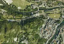 Le domaine du sanctuaire s'organise autour d'un axe central constitué par la double allée menant de la porte Saint-Michel à l'esplanade du Rosaire et par laquelle cheminent quotidiennement les processions et notamment la procession aux flambeaux nocturne. Les basiliques de l'Immaculée-Conception et Notre-Dame-du-Rosaire de Lourdes ferment cette perspective.