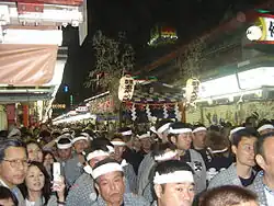 Les principales attractions du festival sont les mikoshi qui apparaissent le troisième et le dernier jour du festival. Ces trois autels de bois peint en vernis noir, ont été construits pour imiter les versions du temple d'Asakusa. Chaque mikoshi est décoré avec des sculptures et des feuilles d'or ; un mikoshi pèse approximativement une tonne et coûte quarante millions de yens[4]. Ils sont constitués de quatre longs poteaux attachés ensemble avec des cordes, et il faut la force de quarante personnes pour le porter. Tout au long de la journée, environ 500 personnes se relayent pour porter chaque autel[4].