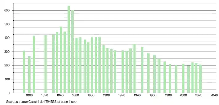 L'évolution du nombre d'habitants est connue à travers les recensements de la population effectués dans la commune depuis 1793. Pour les communes de moins de 10 000 habitants, une enquête de recensement portant sur toute la population est réalisée tous les cinq ans, les populations de référence des années intermédiaires étant quant à elles estimées par interpolation ou extrapolation[13]. Pour la commune, le premier recensement exhaustif entrant dans le cadre du nouveau dispositif a été réalisé en 2006[14].