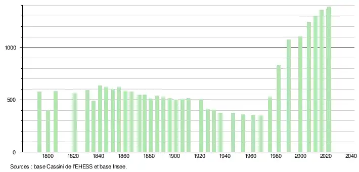 L'évolution du nombre d'habitants est connue à travers les recensements de la population effectués dans la commune depuis 1793. Pour les communes de moins de 10 000 habitants, une enquête de recensement portant sur toute la population est réalisée tous les cinq ans, les populations de référence des années intermédiaires étant quant à elles estimées par interpolation ou extrapolation[13]. Pour la commune, le premier recensement exhaustif entrant dans le cadre du nouveau dispositif a été réalisé en 2006[14].