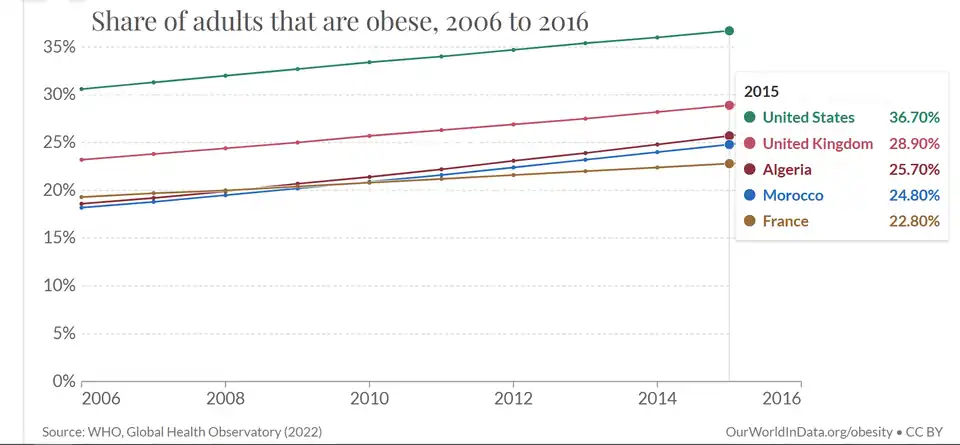On estime en 2016 que près 24,8% des marocains sont obèses, l'alimentation devenant de plus en plus industrielle.