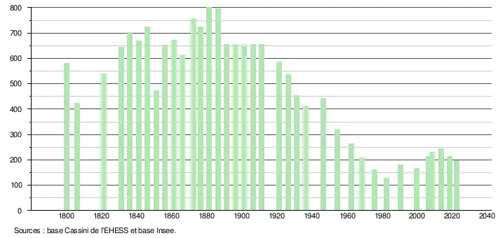 L'évolution du nombre d'habitants est connue à travers les recensements de la population effectués dans la commune depuis 1800. Pour les communes de moins de 10 000 habitants, une enquête de recensement portant sur toute la population est réalisée tous les cinq ans, les populations de référence des années intermédiaires étant quant à elles estimées par interpolation ou extrapolation[8]. Pour la commune, le premier recensement exhaustif entrant dans le cadre du nouveau dispositif a été réalisé en 2008[9].