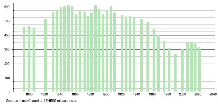 L'évolution du nombre d'habitants est connue à travers les recensements de la population effectués dans la commune depuis 1793. Pour les communes de moins de 10 000 habitants, une enquête de recensement portant sur toute la population est réalisée tous les cinq ans, les populations de référence des années intermédiaires étant quant à elles estimées par interpolation ou extrapolation[21]. Pour la commune, le premier recensement exhaustif entrant dans le cadre du nouveau dispositif a été réalisé en 2006[22].