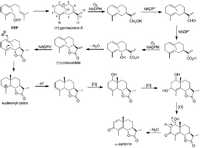 Il a été proposé que le méthylène du (+)-costunolide soit réduit avant la deuxième fermeture du cycle. Le système cyclique de la décaline bicyclique est formé par le cation eudesmyle suivi d'une hydroxylation en C1. Une oxydation supplémentaire en C3 forme le β-cétohydroxyle qui, après élimination de H2O, complète la voie de biosynthèse proposée de l'α-santonine[8].