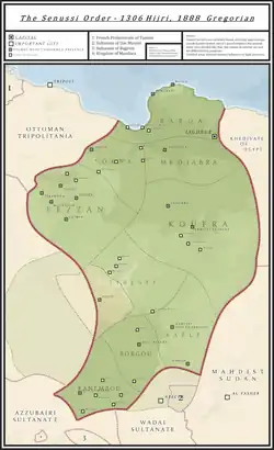Dans le contexte du partage de l'Afrique, elle a combattu contre la pénétration italienne en Libye, où se trouvait le centre de l'ordre des Sanoussis ; son dirigeant était alors à la tête d'un empire qui s'étendait jusqu'en Afrique centrale[Lequel ?]. Le petit-fils du fondateur, le chérif Idris, d'abord défait par les Italiens en 1931, puis devenu roi de Libye à son indépendance en 1951, fut renversé en 1969 par le colonel Khadafi [1].