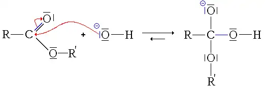 - Première étape : addition nucléophile de l'ion HO− sur l'ester.