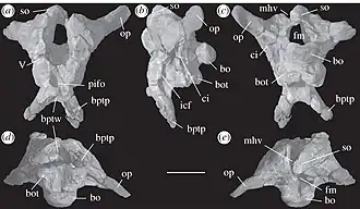 - La même année, une analyse phylogénétique réalisée par Cecilia Apaldetti et ses collègues, le place parmi les Massopoda, proche du genre Ignavusaurus[5] ;