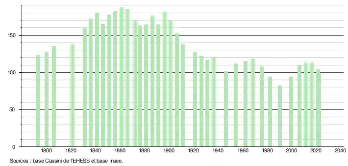 L'évolution du nombre d'habitants est connue à travers les recensements de la population effectués dans la commune depuis 1793. Pour les communes de moins de 10 000 habitants, une enquête de recensement portant sur toute la population est réalisée tous les cinq ans, les populations de référence des années intermédiaires étant quant à elles estimées par interpolation ou extrapolation[17]. Pour la commune, le premier recensement exhaustif entrant dans le cadre du nouveau dispositif a été réalisé en 2006[18].