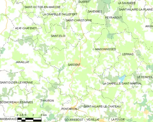 Sardent est limitrophe de dix autres communes, dont Peyrabout au nord-est sur environ 500 mètres.