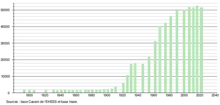 - ↑ Par convention dans Wikipédia, le principe a été retenu de n’afficher dans le tableau des recensements et le graphique, pour les populations de référence postérieures à 1999, que les populations correspondant à une enquête exhaustive de recensement pour les communes de moins de 10 000 habitants, et que les populations des années 2006, 2011, 2016, etc. pour les communes de plus de 10 000 habitants, ainsi que la dernière population de référence publiée par l’Insee pour l'ensemble des communes.