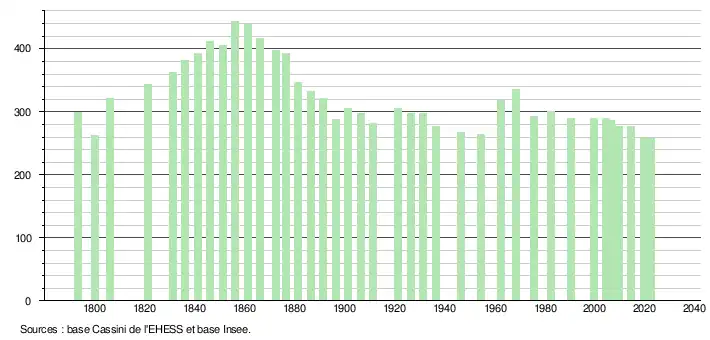 L'évolution du nombre d'habitants est connue à travers les recensements de la population effectués dans la commune depuis 1793. Pour les communes de moins de 10 000 habitants, une enquête de recensement portant sur toute la population est réalisée tous les cinq ans, les populations de référence des années intermédiaires étant quant à elles estimées par interpolation ou extrapolation[29]. Pour la commune, le premier recensement exhaustif entrant dans le cadre du nouveau dispositif a été réalisé en 2004[30].