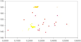 - groupe d'Himalia, resserré, dont les demi-grands axes sont de l'ordre de 11,86 ± 0,695 Gm et les inclinaisons de 27,5 ± 0,8° ; les excentricités varient de 0,11 à 0,25 ;