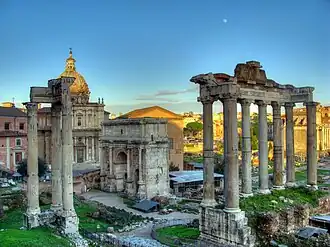 Rome, huit colonnes restantes du Temple de Saturne (à droite).