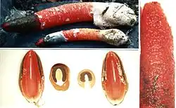 - Mutinus caninus est "capité" par une courte "tête" adhérente, nettement délimitée par un renflement et une dépression en forme d'amande, contrastant aussi par sa couleur rouge orangé sous la gléba[13],[14]. Odeur faible, de tabac et des basides 6-spores.