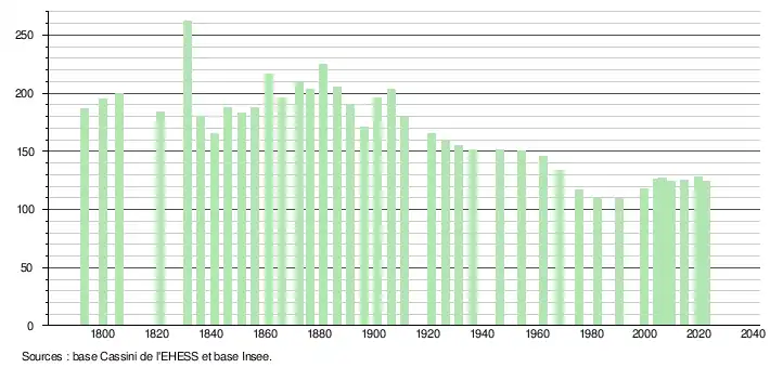 L'évolution du nombre d'habitants est connue à travers les recensements de la population effectués dans la commune depuis 1793. Pour les communes de moins de 10 000 habitants, une enquête de recensement portant sur toute la population est réalisée tous les cinq ans, les populations de référence des années intermédiaires étant quant à elles estimées par interpolation ou extrapolation[25]. Pour la commune, le premier recensement exhaustif entrant dans le cadre du nouveau dispositif a été réalisé en 2004[26].