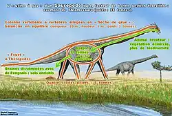 - ↑ L'allongement du cou s'est produit « par deux voies : un allongement de la longueur des vertèbres cervicales (atteignant parfois plus d'un mètre) ou une augmentation de leur nombre (jusqu'à 19), voire les deux simultanément… Comment des vertèbres supplémentaires se sont-elles mises en place dans le cou des sauropodes ? Elles se sont ajoutées par conversion de vertèbres dorsales en cervicales. Mais il est possible que dans certaines branches du groupe des sauropodes, le cou ait eu tendance à se raccourcir ». Cf Jean-Paul Billon-Bruyat, et Damien Becker, « Les sauropodes, géants agiles », Pour la Science, no 374, , p. 34–42 (lire en ligne).