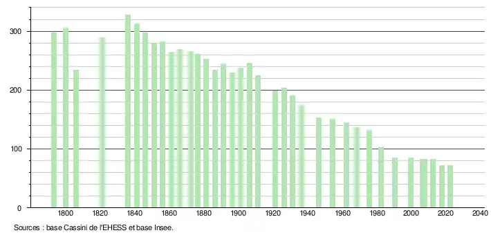 L'évolution du nombre d'habitants est connue à travers les recensements de la population effectués dans la commune depuis 1793. Pour les communes de moins de 10 000 habitants, une enquête de recensement portant sur toute la population est réalisée tous les cinq ans, les populations de référence des années intermédiaires étant quant à elles estimées par interpolation ou extrapolation[12]. Pour la commune, le premier recensement exhaustif entrant dans le cadre du nouveau dispositif a été réalisé en 2007[13].