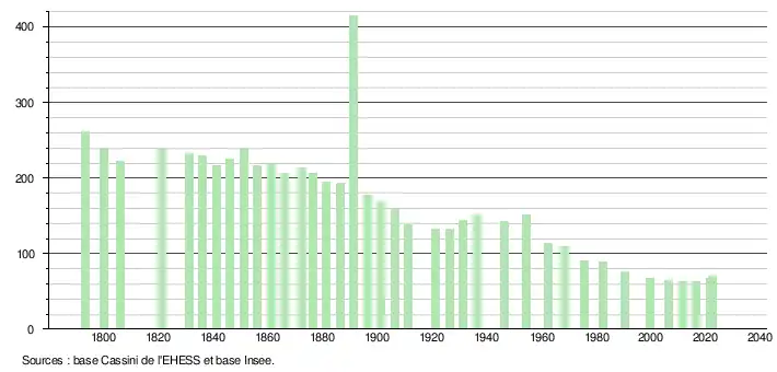L'évolution du nombre d'habitants est connue à travers les recensements de la population effectués dans la commune depuis 1793. Pour les communes de moins de 10 000 habitants, une enquête de recensement portant sur toute la population est réalisée tous les cinq ans, les populations de référence des années intermédiaires étant quant à elles estimées par interpolation ou extrapolation[20]. Pour la commune, le premier recensement exhaustif entrant dans le cadre du nouveau dispositif a été réalisé en 2006[21].