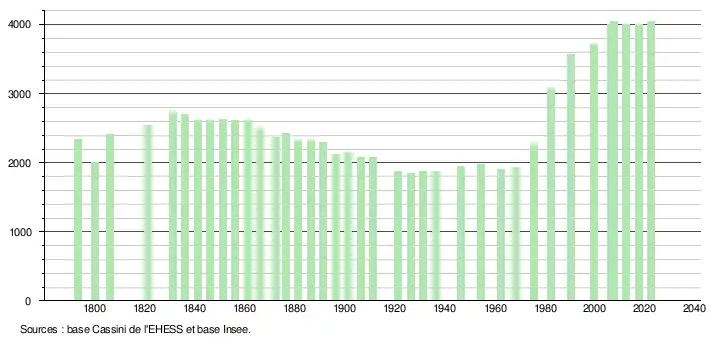 L'évolution du nombre d'habitants est connue à travers les recensements de la population effectués dans la commune depuis 1793. Pour les communes de moins de 10 000 habitants, une enquête de recensement portant sur toute la population est réalisée tous les cinq ans, les populations de référence des années intermédiaires étant quant à elles estimées par interpolation ou extrapolation[20]. Pour la commune, le premier recensement exhaustif entrant dans le cadre du nouveau dispositif a été réalisé en 2007[21].