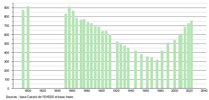 L'évolution du nombre d'habitants est connue à travers les recensements de la population effectués dans la commune depuis 1793. Pour les communes de moins de 10 000 habitants, une enquête de recensement portant sur toute la population est réalisée tous les cinq ans, les populations de référence des années intermédiaires étant quant à elles estimées par interpolation ou extrapolation[45]. Pour la commune, le premier recensement exhaustif entrant dans le cadre du nouveau dispositif a été réalisé en 2008[46].