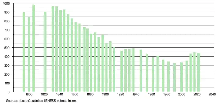 L'évolution du nombre d'habitants est connue à travers les recensements de la population effectués dans la commune depuis 1793. Pour les communes de moins de 10 000 habitants, une enquête de recensement portant sur toute la population est réalisée tous les cinq ans, les populations de référence des années intermédiaires étant quant à elles estimées par interpolation ou extrapolation[33]. Pour la commune, le premier recensement exhaustif entrant dans le cadre du nouveau dispositif a été réalisé en 2006[34].