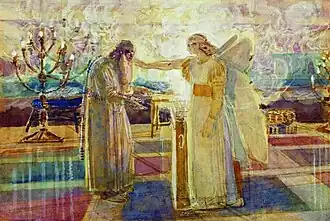 L'Apparition de l'ange Gabriel à Zacharie et le frappant de mutisme parce qu'il n'a pas cru à ses paroles annonçant la naissance d'un fils Jean le Baptiste[6], nous communique par l'art subtil d'Ivanov le sentiment du mystérieux et du divin. Sur l'autel brûlent des cierges dont les images renversées se reflètent dans les dalles de marbre du sol. La vapeur de l'encens monte vers le ciel, quand apparaît l'ange illuminé de rayons, semblable aux génies ailés des bas-reliefs assyriens.
