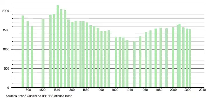 L'évolution du nombre d'habitants est connue à travers les recensements de la population effectués dans la commune depuis 1793. Pour les communes de moins de 10 000 habitants, une enquête de recensement portant sur toute la population est réalisée tous les cinq ans, les populations de référence des années intermédiaires étant quant à elles estimées par interpolation ou extrapolation[24]. Pour la commune, le premier recensement exhaustif entrant dans le cadre du nouveau dispositif a été réalisé en 2008[25].