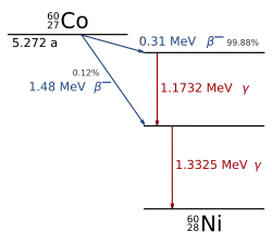 Ces relations peuvent être assez compliquées; ici, un cas simple est montré : le schéma de désintégration d'un isotope radioactif de cobalt, le 60Co. Cet isotope se désintègre en émettant un électron (radioactivité β) avec une demi-vie de 5,27 années dans un état excité de 60Ni, et celui-ci retombe très vite à son état fondamental, en émettant deux photons gamma. Dans un cas sur 1000, l'électron est éjecté avec une énergie qui intègre celle du premier rayon gamma, et seul le second est ensuite émis.