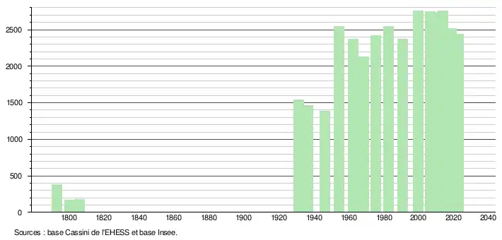 L'évolution du nombre d'habitants est connue à travers les recensements de la population effectués dans la commune depuis 1793. Pour les communes de moins de 10 000 habitants, une enquête de recensement portant sur toute la population est réalisée tous les cinq ans, les populations de référence des années intermédiaires étant quant à elles estimées par interpolation ou extrapolation[20]. Pour la commune, le premier recensement exhaustif entrant dans le cadre du nouveau dispositif a été réalisé en 2008[21].