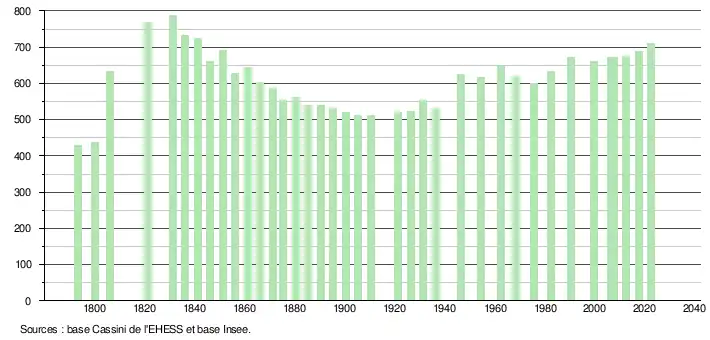 - ↑ Population municipale de référence en vigueur au 1er janvier 2025, millésimée 2022, définie dans les limites territoriales en vigueur au 1er janvier 2024, date de référence statistique : 1er janvier 2022.