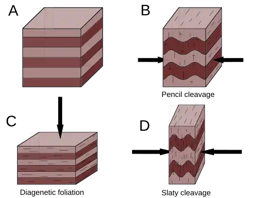 - schistosité cristallophyllienne ou foliation : cristallisation de nouveaux minéraux en paillettes dans les plans de schistosité[4].