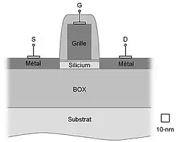 Le transistor MOSFET à contacts source et drain Schottky (ou Schottky Barrier (SB) MOSFET) est basée sur une structure MOS à deux jonctions Schottky en lieu et place des zones de source et drain conventionnellement très dopées et de leurs extensions[1]. Les diodes Schottky sont alors en vis-à-vis et le potentiel interne aux interfaces est alors partiellement contrôlé par le champ de la grille. Cette architecture est issue de la volonté de résoudre des défis majeurs posés sur la technologie MOSFET qui concernent le contrôle des courants de fuite, la formation des jonctions Source/Drain (S/D) parfaitement abruptes au bord de la grille, les excès de résistances et de capacités parasites, etc[2]. Dans ce contexte, cette ingénierie S/D prend une importance à part entière dans le développement des prochaines générations de transistors CMOS (sub-30-nm).