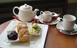 Les scones sont principalement constitués de blé, orge ou avoine, avec de la levure comme levain. Pris avec du thé, de la confiture et une crème épaisse nommée clotted cream, il constitue un des composants du cream tea vendu comme ensemble au Royaume-Uni.