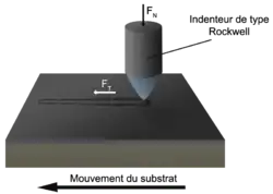 Le scratch test (terme anglais) permet de caractériser de manière qualitative des couches minces et des revêtements. Cette mesure s'effectue en appliquant une force croissante sur un pénétrateur (de type rockwell) se déplaçant horizontalement tout en mesurant la force de friction, la force de pénétration et les vibrations acoustiques émises[1].