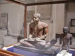 Le scribe accroupi[6] fut découvert à Saqqarah en 1850. Fait de calcaire, de cristal de roche, de cuivre et de magnésie, ce scribe était certainement un haut fonctionnaire, un personnage important de son époque. Il était placé dans la chapelle de culte d’une tombe, la statue participait aux cérémonies et recevait les offrandes pour le défunt. Sa fonction avait donc un caractère funéraire.