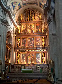 Retable du maître-autel de la Basilique de l'Escorial (es) (1583-1586), l'une des plus grandes entreprises artistiques du XVIe siècle[21], conçu par Juan de Herrera et dirigé par Pedro Castello (es), avec structure et garde de matériaux nobles de Jacometrezo (es), sculptures en bronze de Leon Leoni et Pompeo Leoni et peintures de Federico Zuccaro et Pellegrino Tibaldi (initialement, il était prévu de placer Le Martyre de Saint Laurent, de Titien, une Annonciation de Véronèse et une Nativité du Tintoret, qui ont été reléguées à d'autres endroits dans le Monastère, préférant conserver une unité de style). La voûte présente des fresques de Luca Cambiasso, et les côtés abritent les cénotaphes de la famille royale, œuvre des Leoni.