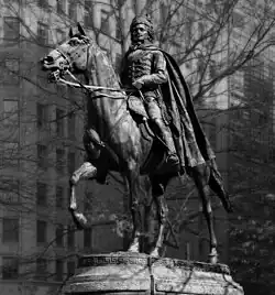 Dès ses débuts, la sculpture américaine fut immanquablement influencée par la sculpture européenne. En témoignent les nombreuses statues équestres. Ce furent d'abord bien évidemment les grands personnages de l'histoire américaine qui furent l'objet de cette représentation. Bien vite cependant, plusieurs artistes américains sont allés parfaire leurs connaissances et leur technique auprès de grands maîtres en Europe si bien qu'imprégnés de la culture de ce continent, ils ne purent restés insensibles au désir de retrouver sur le sol américain des représentations de personnages qui marquèrent l'histoire européenne. Aux côtés des George Washington[77], James Garfield[78], Nathanael Greene[79], et de bien d'autres apparurent dans la capitale américaine les Christophe Colomb[80], Dante Alighieri[81], Isabelle Ire de Castille[82], Martin Luther[83]... Les personnages de la France furent parmi les premiers à connaître cet honneur avec, entre autres, le marquis Gilbert de Lafayette[27] et Louis Daguerre[84] qui firent leur apparition au début de la décennie 1890 alors que la plupart de ces grandes figures européennes devront attendre le XXe siècle.