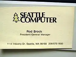Seattle Computer Products était domiciliée au 1114 Industry Dr. Seattle WA 98188, comme on peut le voir sur la carte de visite professionnelle de Mr Rod Brock, avec le titre de « président/directeur général ».