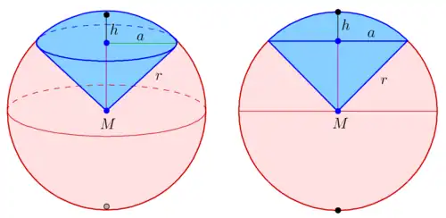 Si on note r le rayon de la sphère et h la hauteur de la calotte sphérique, le volume du secteur sphérique est[3]: