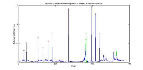 Le principe général est d'extraire une observation sur chaque image, et de définir ensuite une distance[9] (ou mesure de similarité) entre observations. L'application de cette distance entre deux images successives, sur l'ensemble du flux vidéo, produit un signal unidimensionnel, dans lequel on cherche alors les pics (resp. creux si mesure de similarité), qui correspondent aux instants de forte dissimilarité.