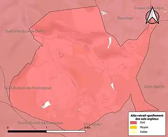 Les mouvements de terrains susceptibles de se produire sur la commune sont des tassements différentiels[38]. Le retrait-gonflement des sols argileux est susceptible d'engendrer des dommages importants aux bâtiments en cas d’alternance de périodes de sécheresse et de pluie[39]. 99,5 % de la superficie communale est en aléa moyen ou fort (58,6 % au niveau départemental et 48,5 % au niveau national métropolitain)[Carte 4]. Depuis le , en application de la loi ÉLAN, différentes contraintes s'imposent aux vendeurs, maîtres d'ouvrages ou constructeurs de biens situés dans une zone classée en aléa moyen ou fort[Note 4],[40].